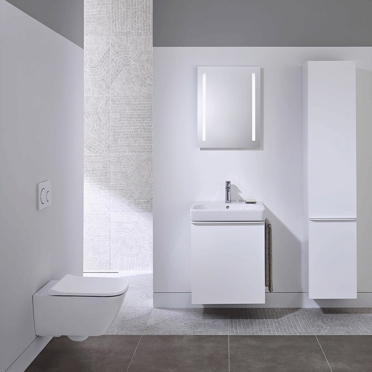 Комплект унитаза Geberit Smyle 500.300.21.S с инсталляцией Geberit Sigma, сиденьем soft-close и клавишей смыва цвета хром. Эффективная безободковая система смыва.
