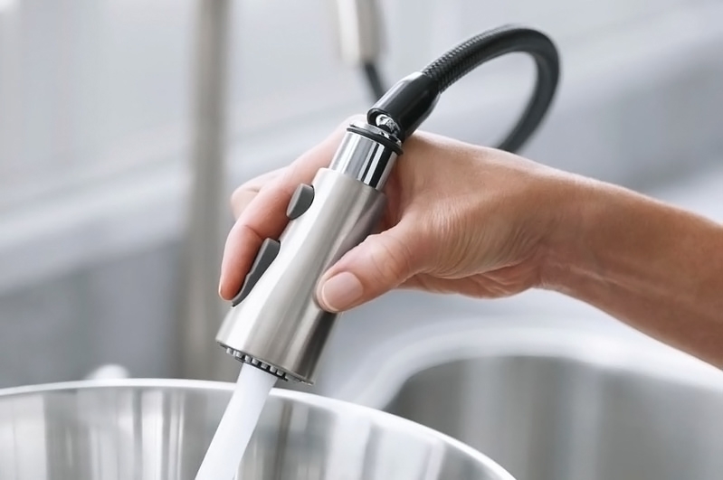 Высокий смеситель для кухни Jacob Delafon Simplice 596D-VS монтируемый в одно отверстие, однорычажный, с выдвижным, поворотным, трехрежимным изливом.
