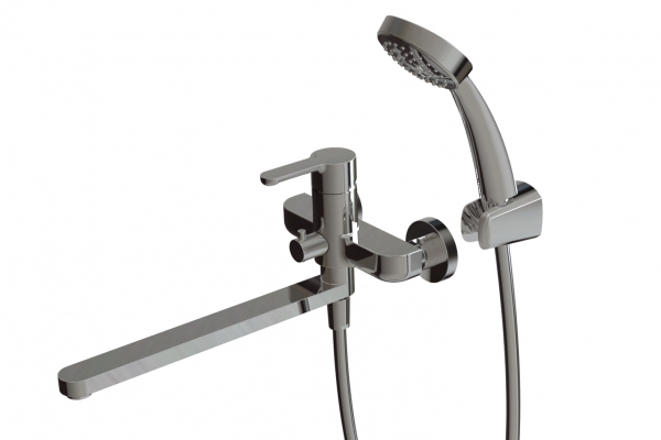 Смеситель для ванны с длинным изливом Bravat Stream F63783C-LB с керамическим переключателем, аэратором. В комплект входит смеситель, 1-функциональная душевая лейка (ABS-пластик), шланг 1500 мм, настенный держатель.
