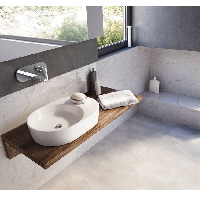 Стильная раковина-чаша Ravak Moon 2S 56 XJN01300003 овальной формы с небольшой полочкой сбоку.