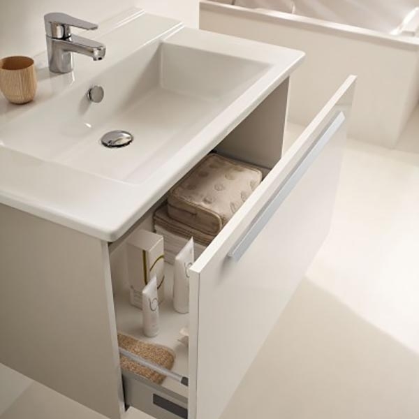 Тумба оснащена механизмами плавного и бесшумного закрытия, направляющими скрытого монтажа.
