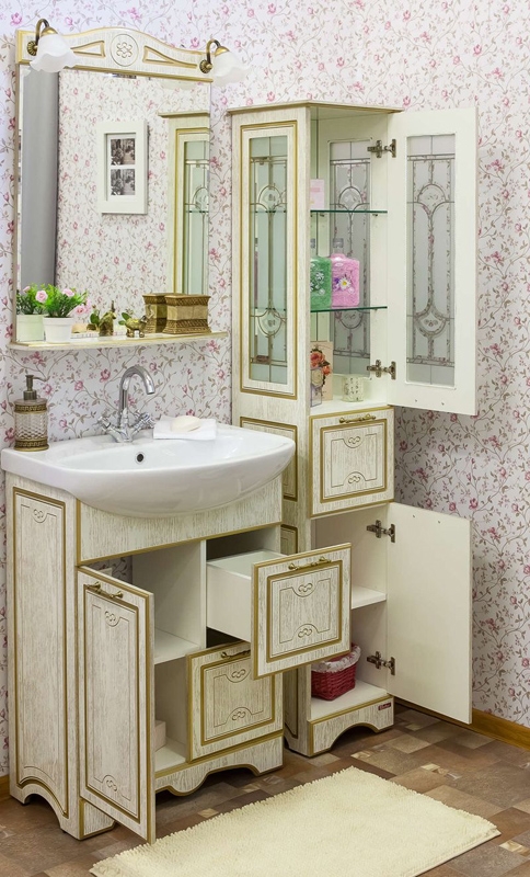Напольная Тумба с раковиной Sanflor Адель 65 Н0000000554 белого цвета с золотым патинированием, с одной распашной дверцей и двумя выдвижными ящиками, для использования в ванных комнатах с повышенной влажностью.