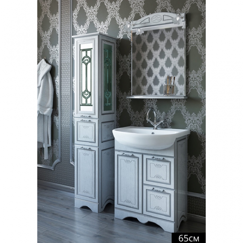 Зеркало Sanflor Адель 65 Н0000000552 подвесное, в раме белого цвета с серебряным патинированием, с открытой нижней полкой, с двумя светильниками в виде цветков.