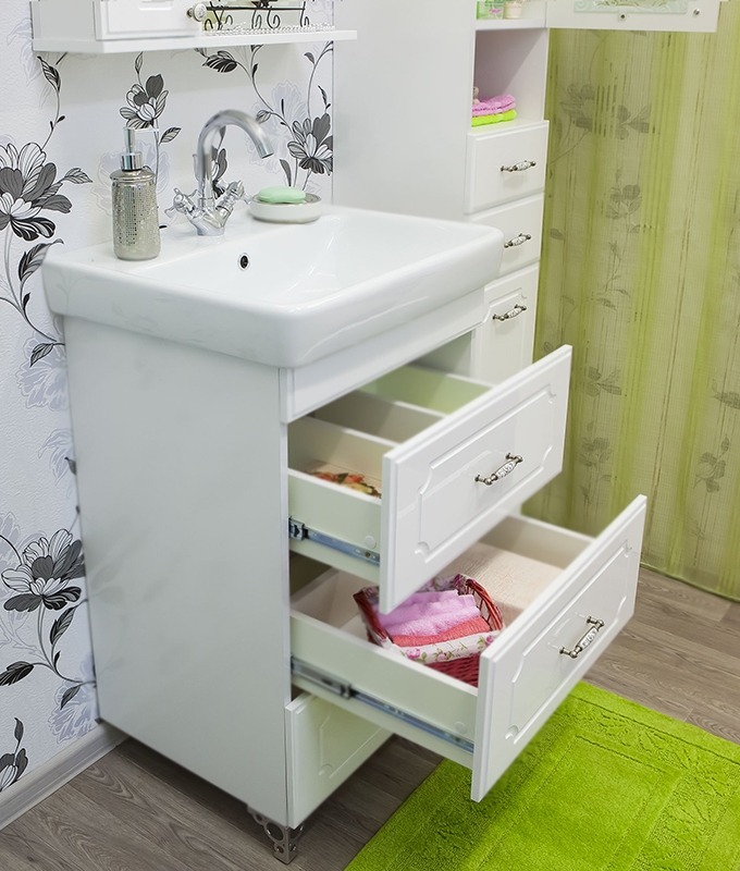 Тумба с раковиной Sanflor Ксения 60 2 Н0000000122 с фрезеровкой, с двумя фигурными ножками, с тремя выдвижными ящиками, для использования в ванных комнатах с повышенной влажностью.