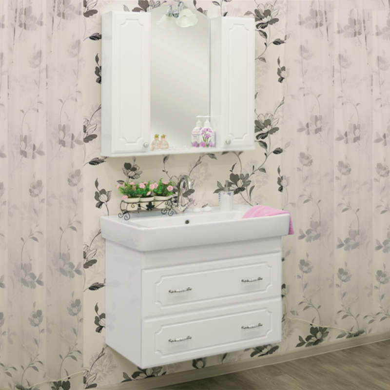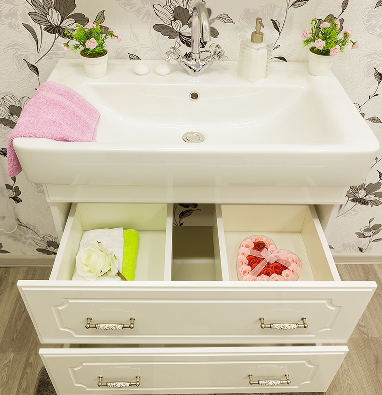 Подвесная Тумба с раковиной Sanflor Ксения 80 Н0000000125 с фрезеровкой, с двумя выдвижными ящиками, для использования в ванных комнатах с повышенной влажностью.