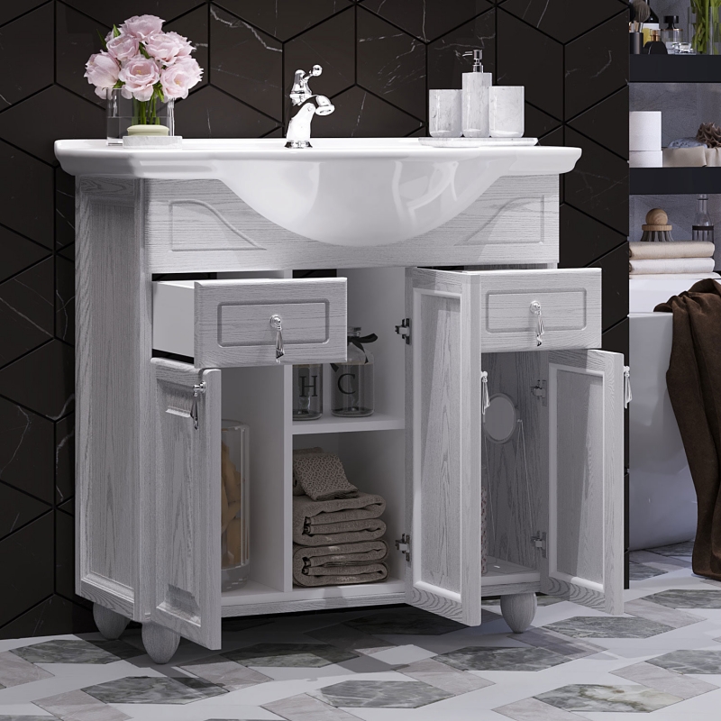 Великолепный дизайн, лаконичность линий и невероятная функциональность и удобство. Прекрасно дополнит интерьер ванной комнаты в стиле кантри. Тумба изготовлена из натурального дерева с ярко выраженной неповторимой текстурой.