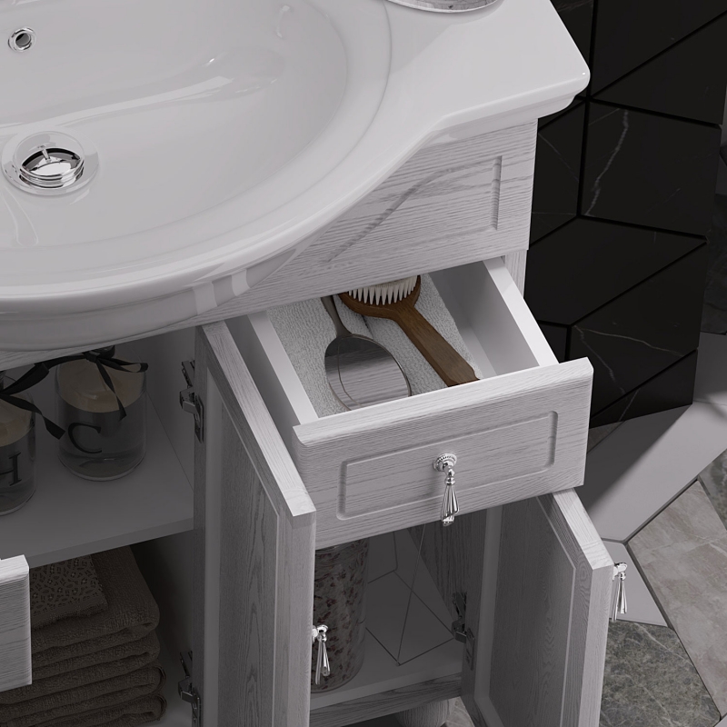 Великолепный дизайн, лаконичность линий и невероятная функциональность и удобство. Прекрасно дополнит интерьер ванной комнаты в классическом стиле. Мебель изготовлена из натурального дерева с ярко выраженной неповторимой текстурой.