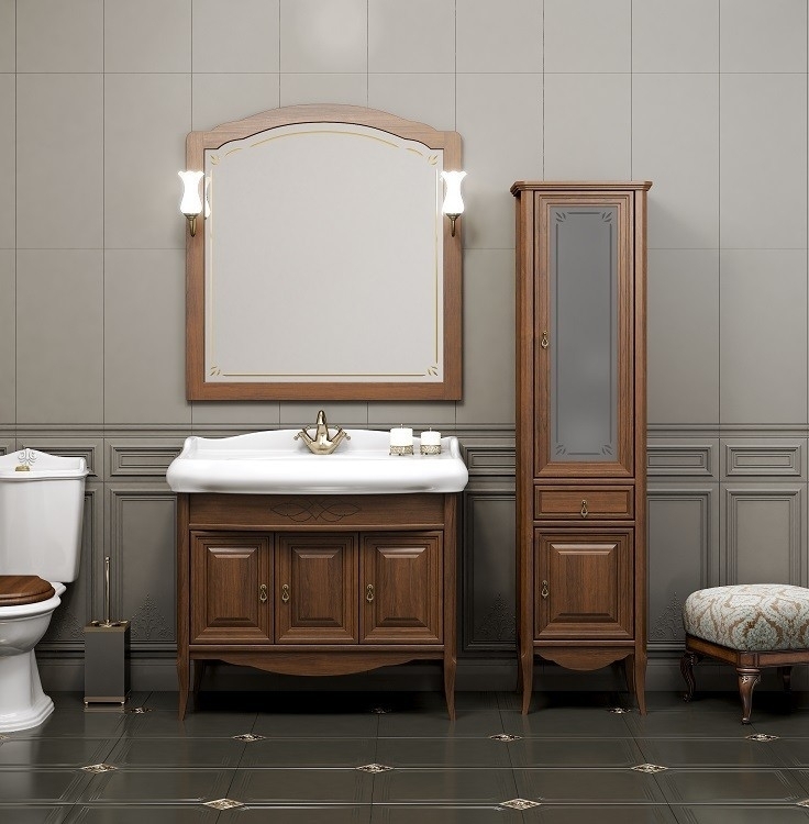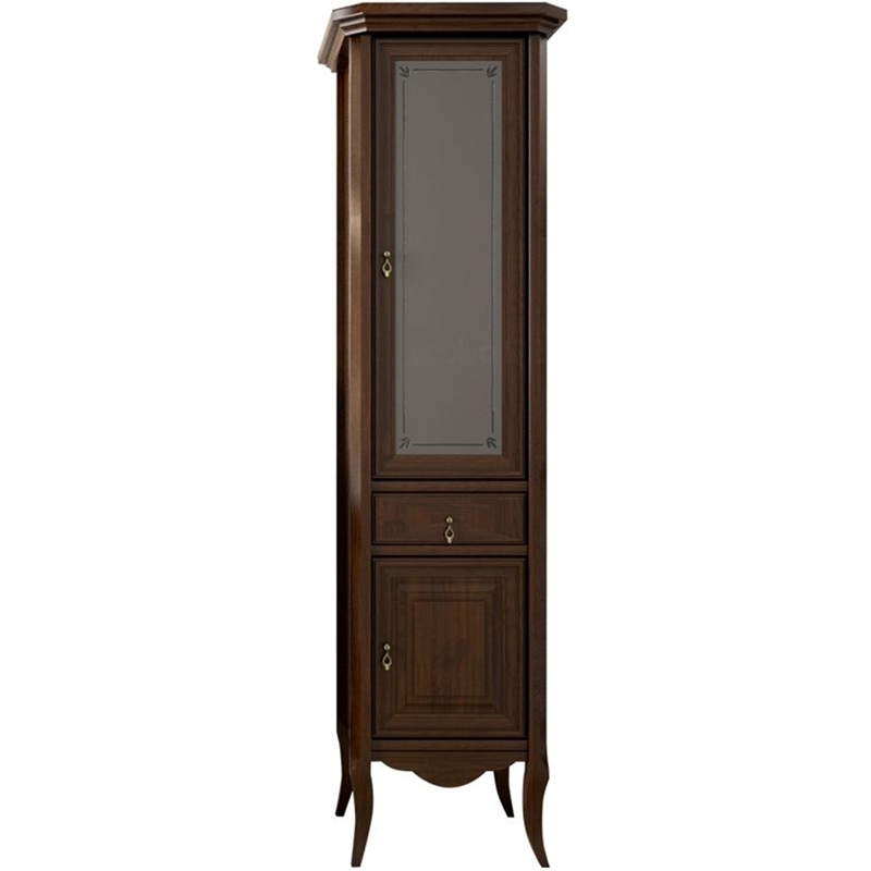 Выполнен в классическом стиле с плавными изогнутыми формами и изящными слегка гнутыми ножками. Фасадные элементы украшены резными узорами, стекло матовое с узором.