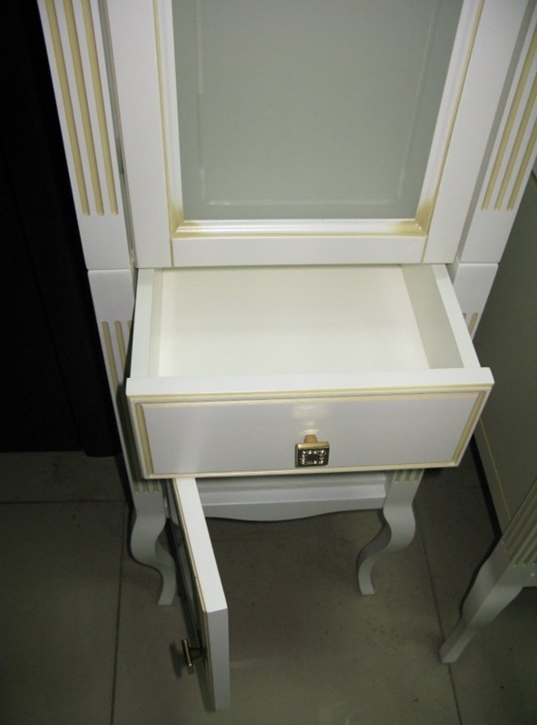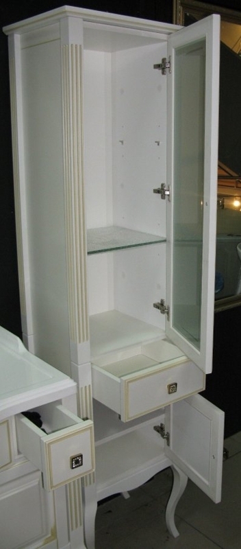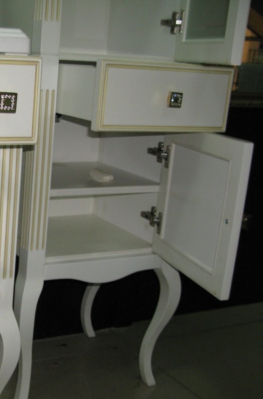 Выполнен в классическом стиле с плавными изогнутыми формами и изящными гнутыми ножками. Фасадные элементы украшены резными узорами. Особую роскошь добавляют ручки инкрустированные кристаллами Swarovski.