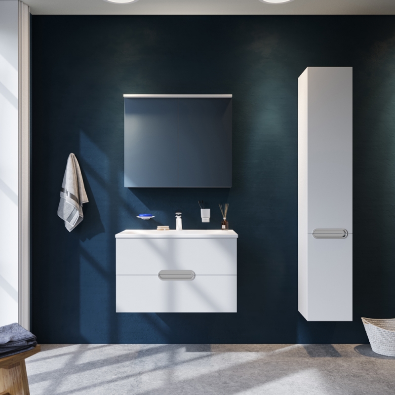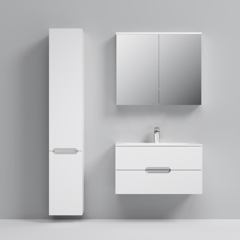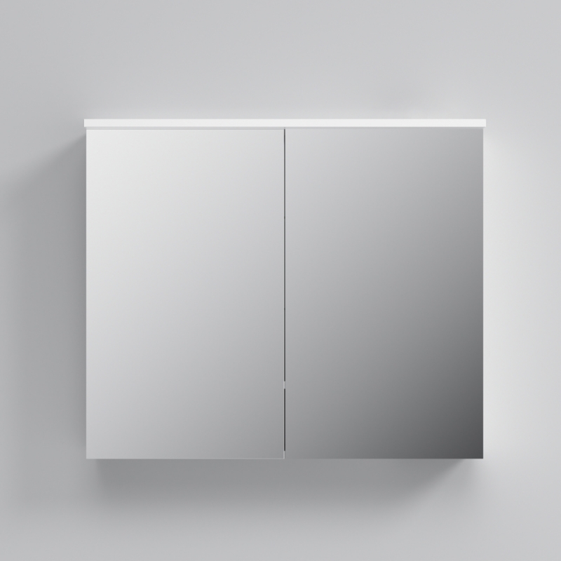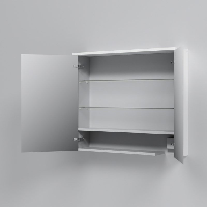 Зеркальный шкаф AM.PM Spirit 80 M70MCX0801WG с двумя распашными дверцами и двумя полками за ними, с подсветкой сверху, с выключателем и розеткой. Для использования в ванных комнатах с повышенной влажностью.