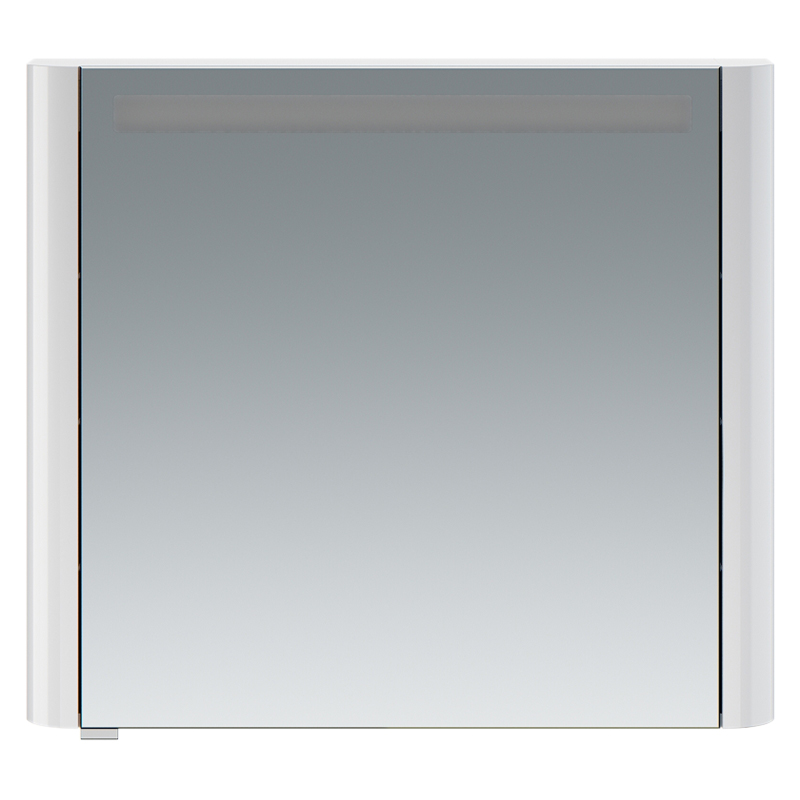 Правосторонний зеркальный шкаф в ванную AM.PM Sensation 80 M30MCR0801WG с одной распашной дверцей и двумя полками за ней, с подсветкой сверху, с розеткой и выключателем.