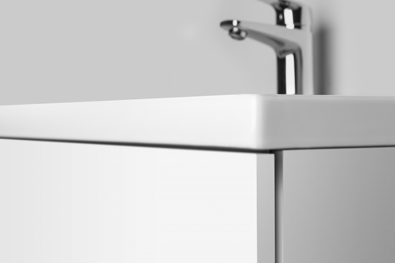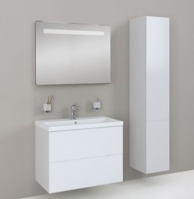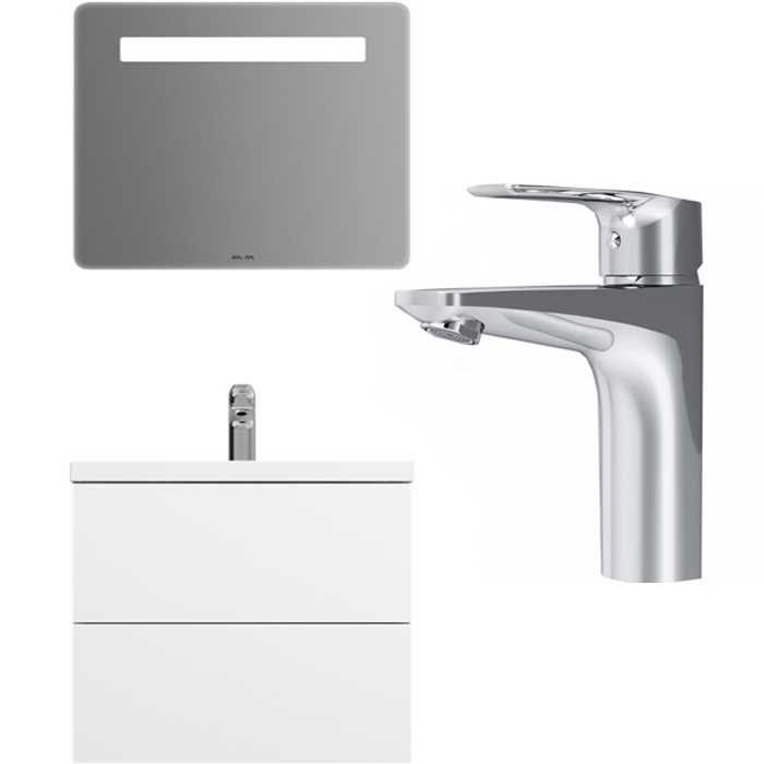 Комплект мебели AM.PM Gem 75 с подвесной тумбой Gem 75 белой глянцевой, с двумя выдвижными ящиками, с фарфоровой раковиной Gem 75, с зеркалом Gem 64 с LED подсветкой, с хромированным смесителем. Для длительного срока службы в ванных комнатах с повышенной влажностью.