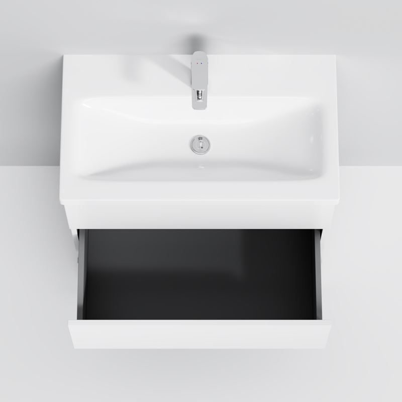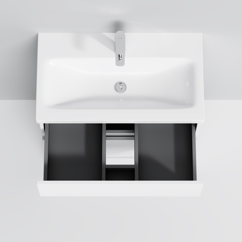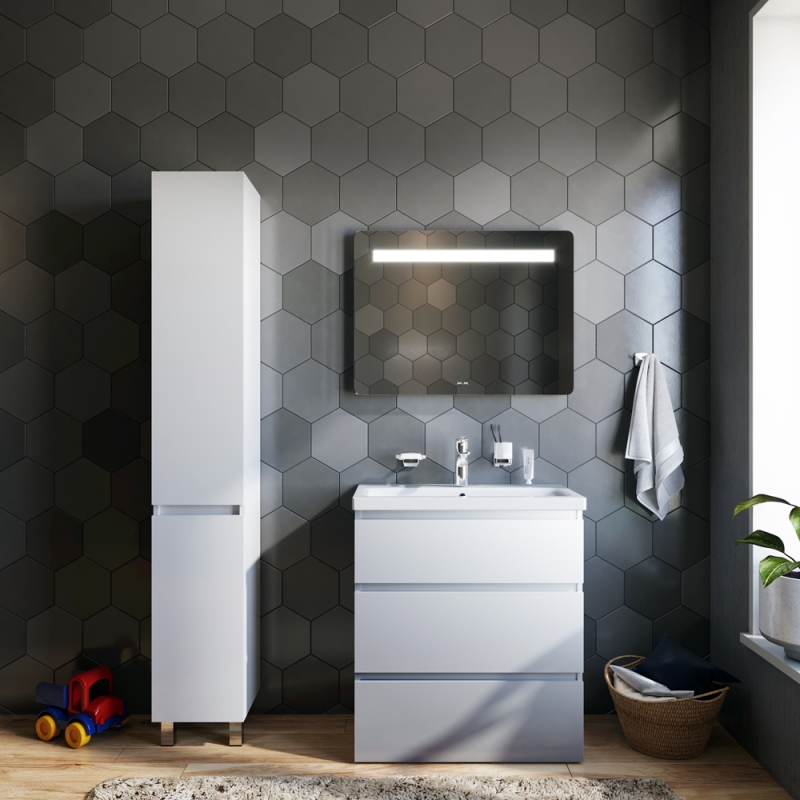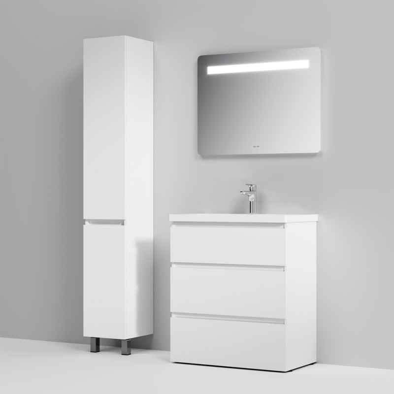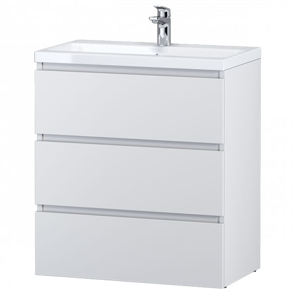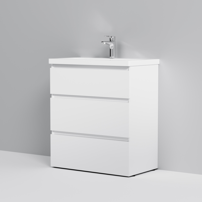 Тумба под раковину AM.PM Gem S 75 M91FSX0752WG белая, с глянцевой поверхностью, с тремя выдвижными ящиками, с двумя хромированными ножками, для длительного срока службы в ванных комнатах с повышенной влажностью.