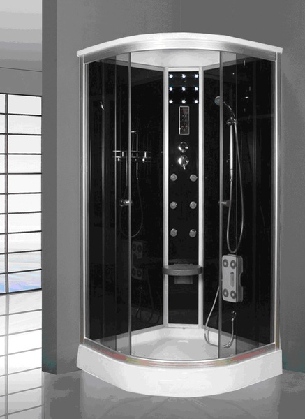 Душевая гидромассажная кабина T-1101. В комплектацию входит: поддон - 15 см, съемный экран, сливная система clik-clak с сифоном, анодированный алюминиевый профиль (матовый хром), закаленное стекло 5 мм, сенсорный пульт управления, подсветка верхняя и боковая, FM-радио, вентиляция, смеситель однорычажный - три режима, тропический душ, лейка, спинной массаж 6 форсунок, двойные ролики, стеклянная полочка, диспенсер, откидное сиденье.