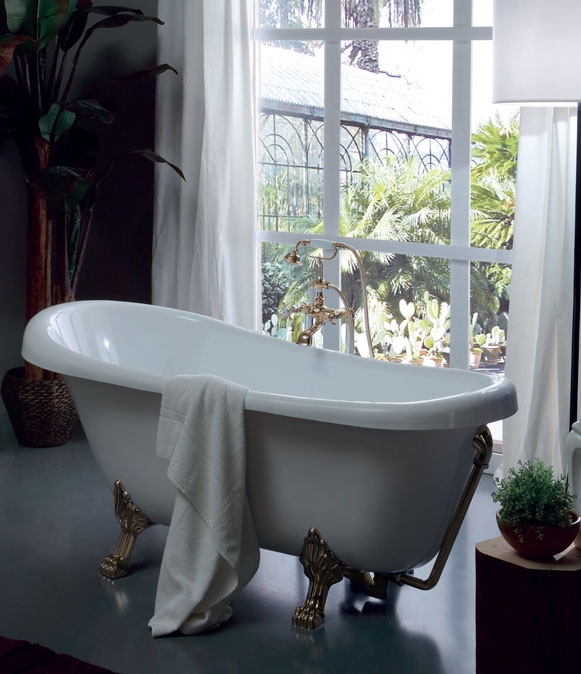 Отдельностоящая акриловая ванна Kerasan Retro 170x77 105591 bi/oro на изящных львиных лапах, с внешним декоративным сливом-переливом, с удобным наклоном для поддержки спины.
