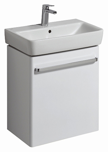 Тумба под раковину Geberit (Keramag) Renova Nr. 1 Comprimo 862060000. Дверцы могут крепиться на правую или на левую сторону. Передняя панель МДФ. Корпус ДСП. Ширина 55 см. Высота 60. Глубина 33 см. Вес 13,0 кг. Цвет корпуса белый матовый, фасада белый глянец.
