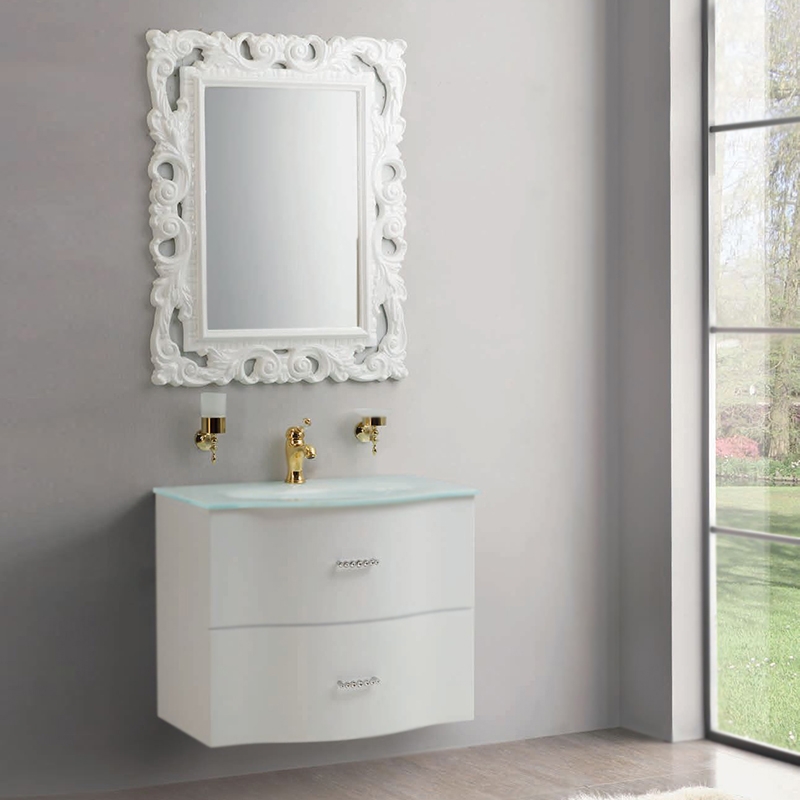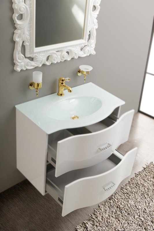 Подвесная тумба под раковину Cezares Petalo 80 PETALO-800-2C-SO-BL-P с двумя выдвижными ящиками. Предназначена для использования в ванных комнатах с повышенной влажностью. Ящики оснащены направляющими скрытого монтажа полного выдвижения с доводчиками Eurosoft итальянского производства.